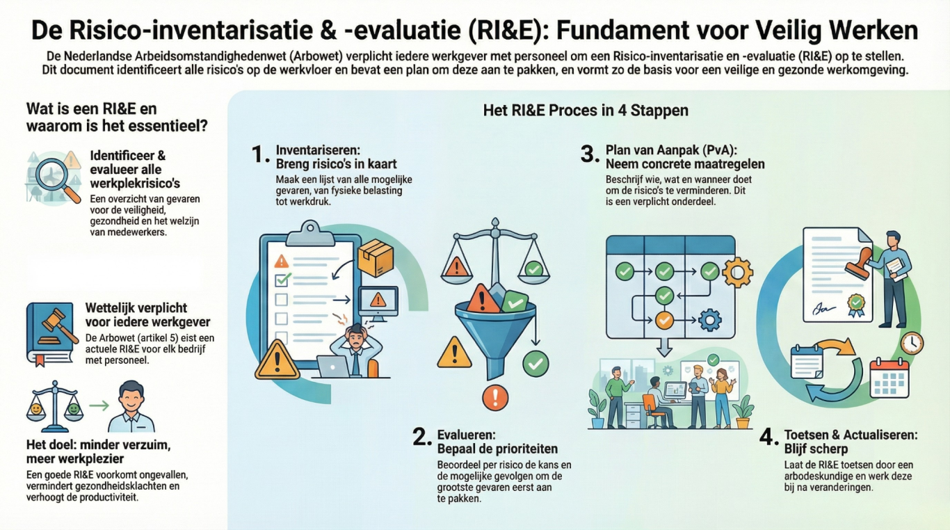 Risico-inventarisatie en -evaluatie (RI&E) is een wettelijk vereiste voor werkgevers in Nederland. Het betreft het identificeren en beoordelen van risico's op de werkplek. Dit proces moet regelmatig worden herzien om aan de steeds veranderende omstandigheden te voldoen.